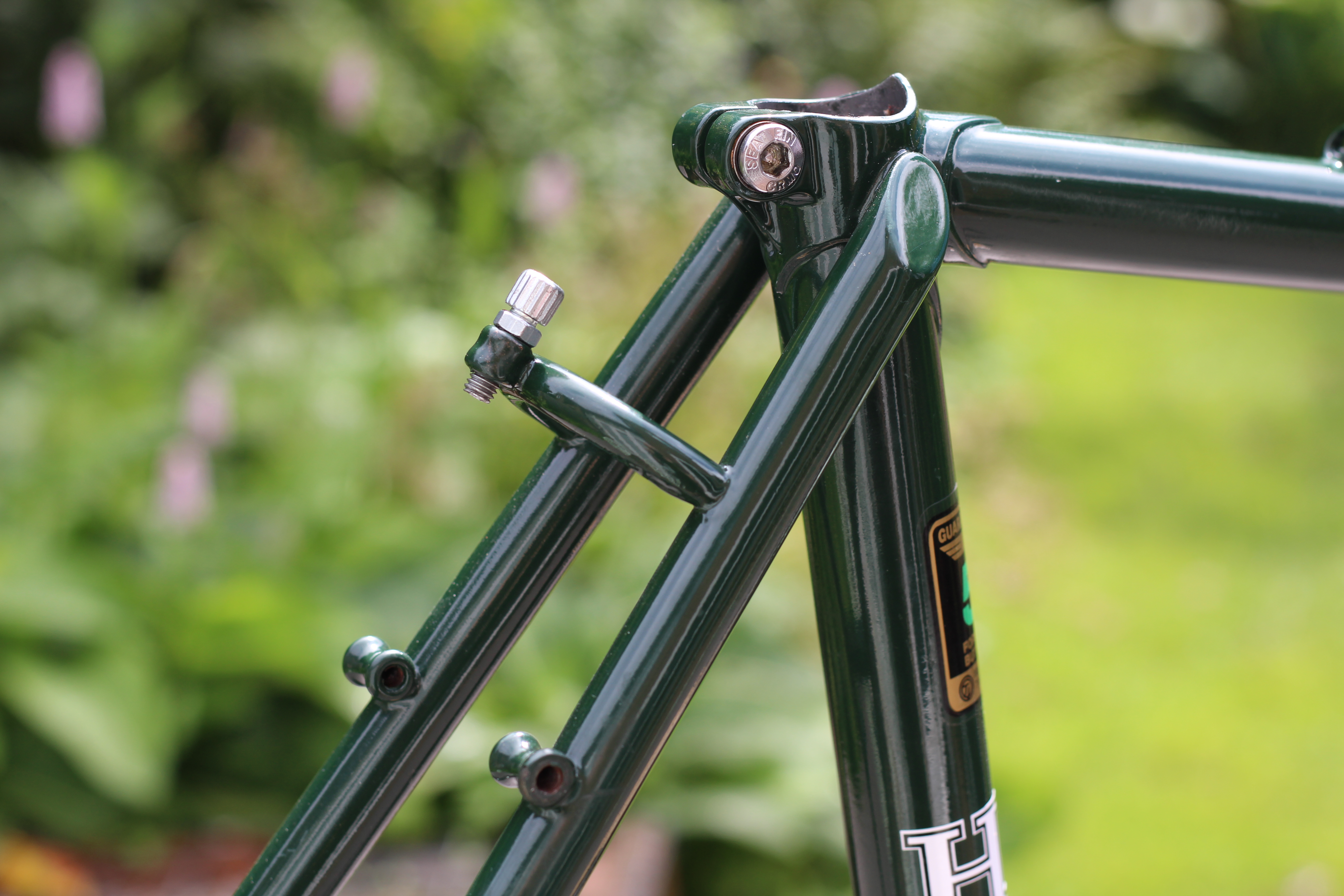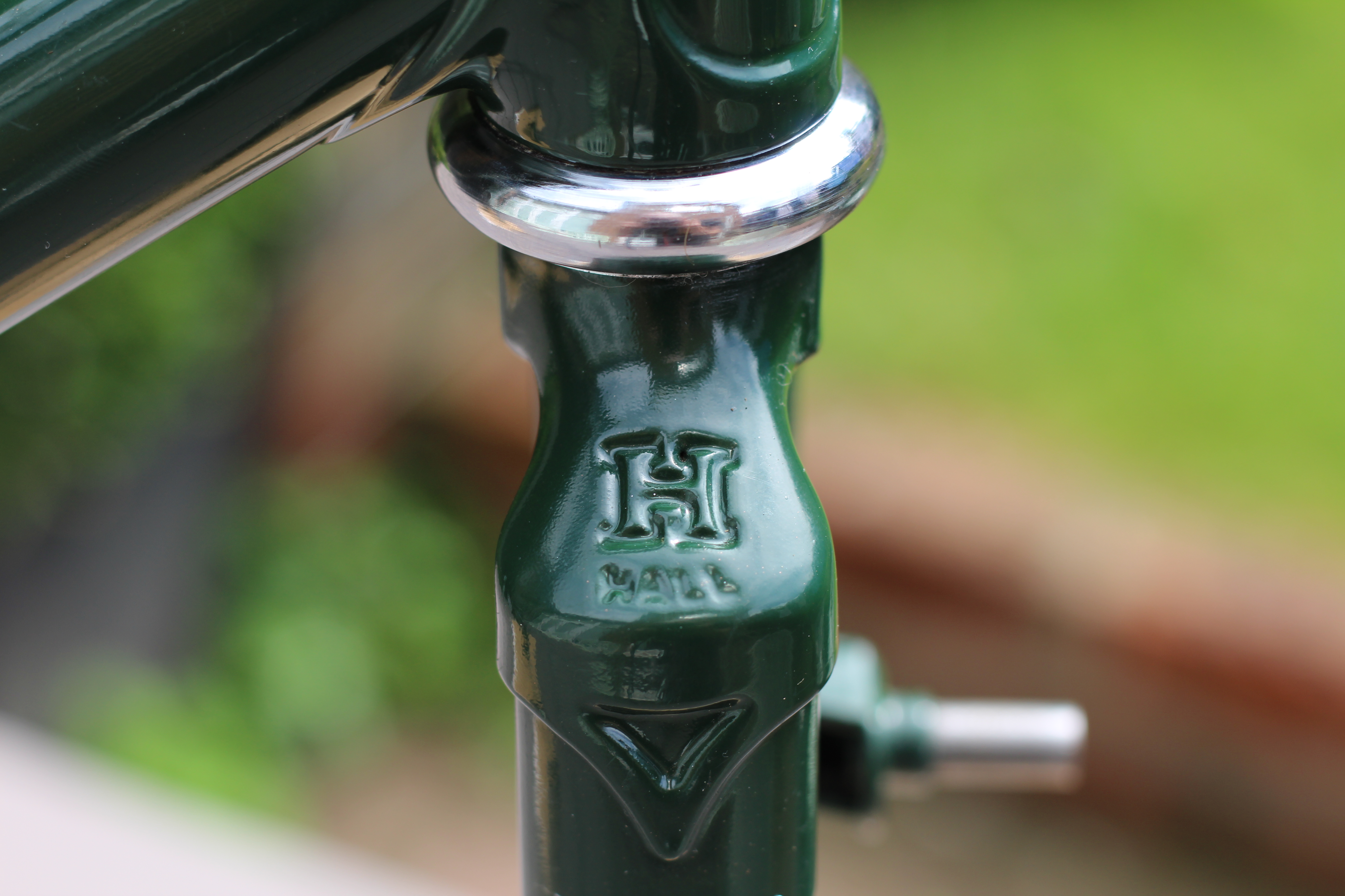 A Harry Hall frame in British Racing Green, that will be a stab at a Rough Stuff Fellowship bike of a bygone era (that is, completely unsuited for off-road). Harry Hall ran a shop in Manchester; it’s still there, but not in its original location and I think I’m right in saying they don’t make their own frames. In fact, when they did, it wasn’t Harry Hall that made them; there was an in-house builder – Roger Kowalski – and work was also outsourced to the likes of the builders at Bob Jackson in Leeds. It was as a mechanic that Harry Hall cemented his reputation, providing a free neutral race service at UK events and serving as a team mechanic for the national team at international races (he was at the infamous 1967 Tour de France where Tom Simpson died on the slopes of Mount Ventoux).