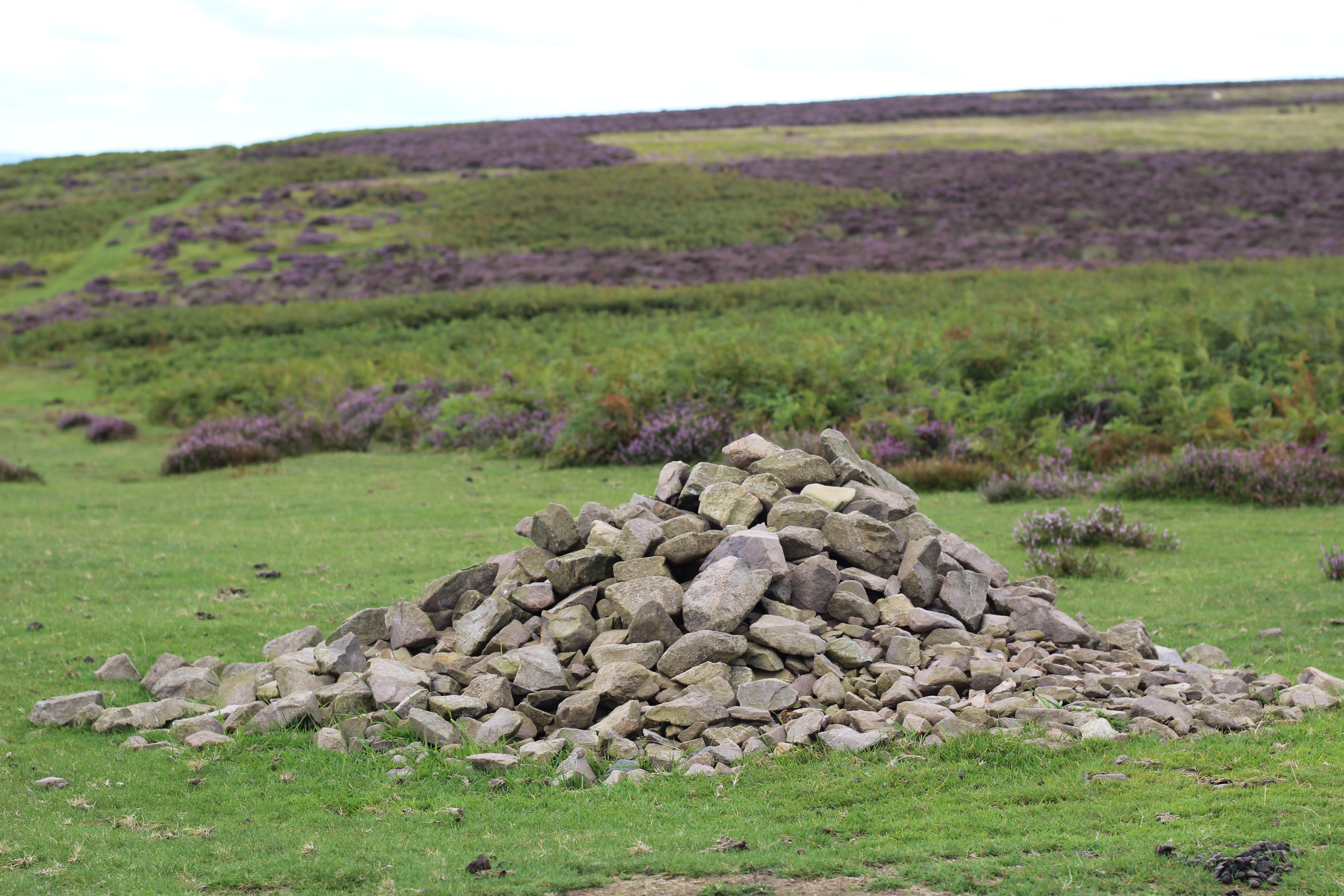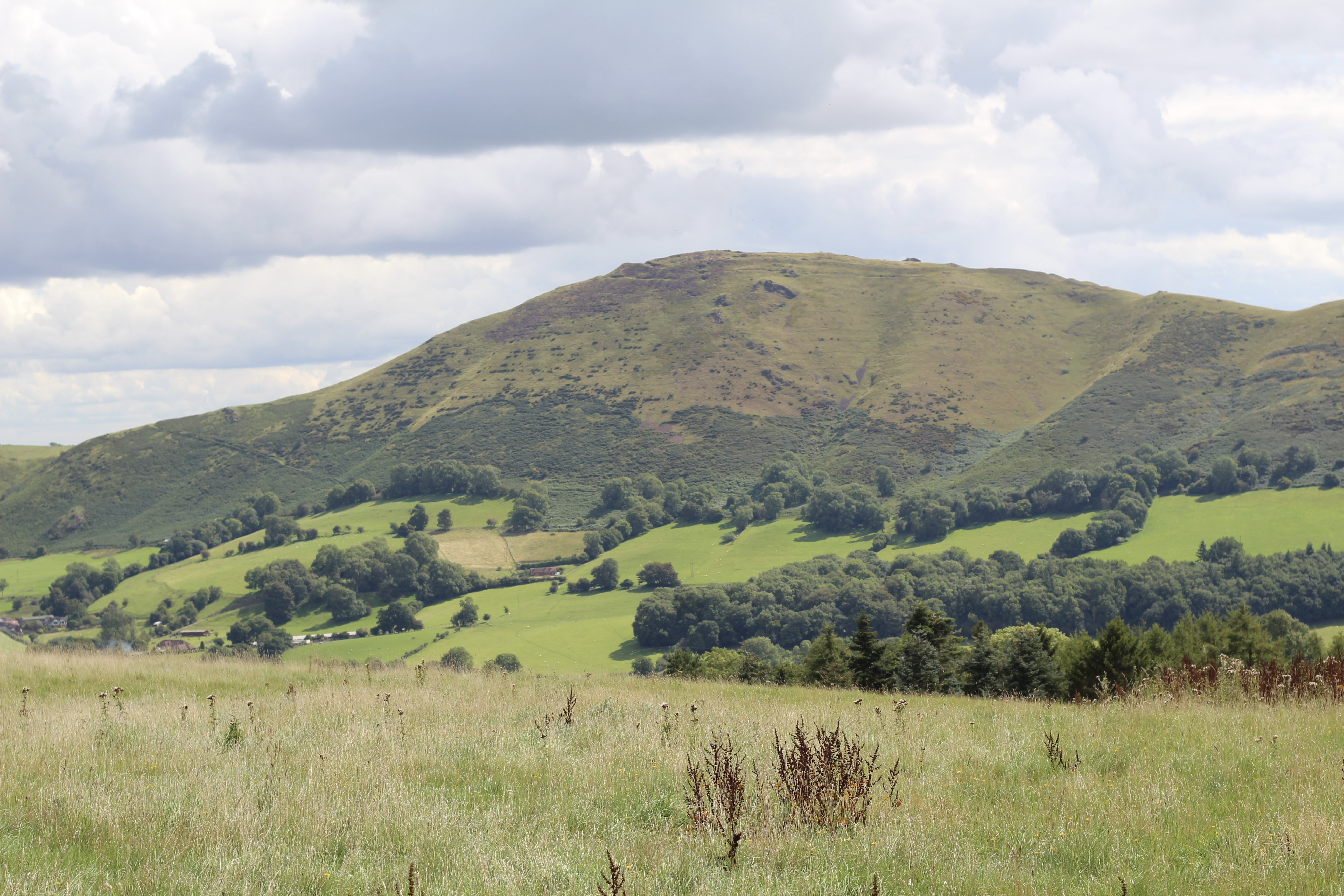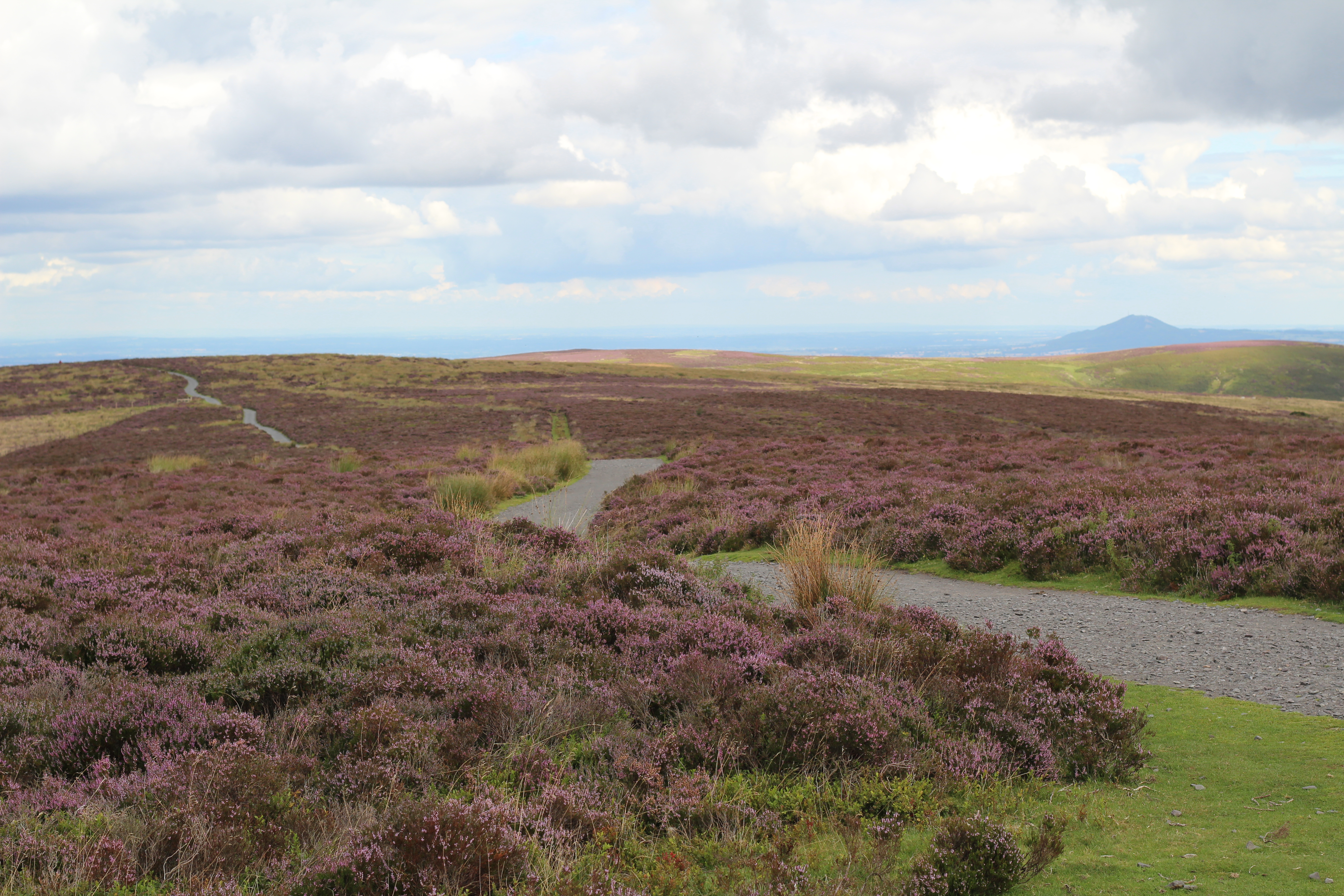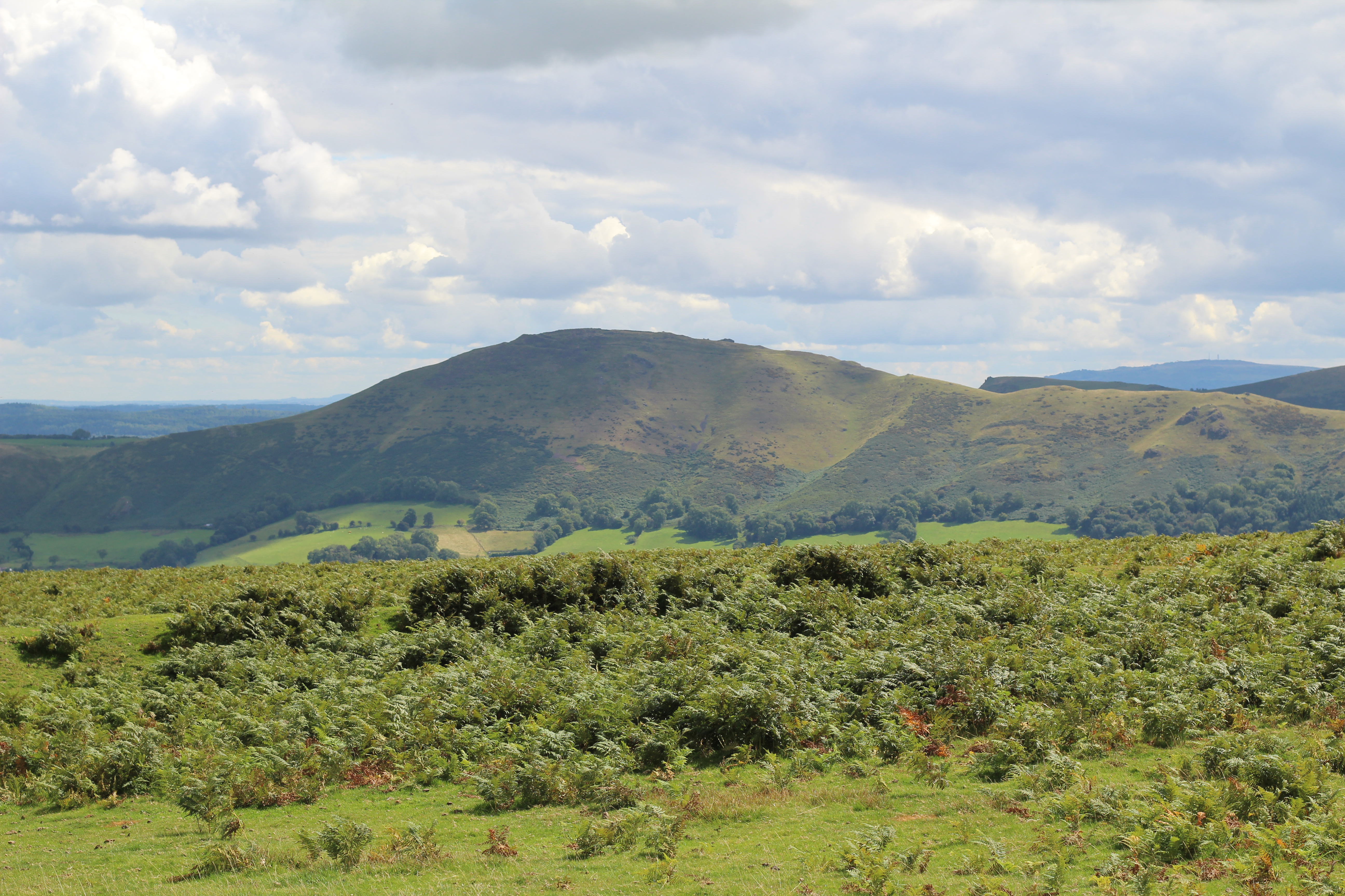 It was then on towards All Stretton. The Burway was closed (perhaps by bike it was possible to ride) but it was never intended to be the route up Long Mynd (the horror of previous ascents still haunts me) and we ignored Carding Mill Valley too (a rocky climb that the last time I attempted I certainly didn’t have a basket as company and still ended up taking my bike for a walk). Castle Hill was the planned route up; a sealed road but with a couple of steep sections, just not The-Burway-steep. My son on The Red Bike had a lowest gear of 18 inches, The Blue Bike offered me 19 inches – we plodded up and at Jinlye swapped tarmac for gravel and took a breather. Looking back from where we had come, The Lawley and Caer Caradoc Hill were prominent.
