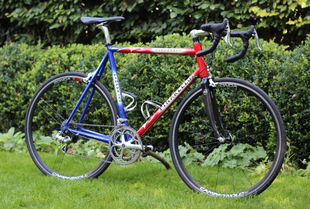 The Pinarello was the training bike in the days of folly, and then, residing in Catalunya, it was the bike I rode whenever visiting the Catalan side of the family. Back then, the 39×29 lowest gear was enough for a country as lumpy as Spain. The Montseny Massif sits on the doorstep of my wife’s home village, and the Pinarello accompanied me up and down its contours, even getting me up to its high point of Turo de l’Home. Slightly further afield, the Pyrenees were ventured around too, a ride starting and finishing in Ribes de Freser, and taking in the Coll de la Merolla, the Coll de la Creueta (same derivation as cruel – yes, a tough one), and the Collada de Toses, sticks in the memory. I still ride in those parts, but a different steed; the Pinarello now sits attached to a turbo and ignored as much as possible in my trying to avoid the tedium of cycling indoors. Like the Gios, it’s Italian made, when Pinarello still did such things. The frame welds are not hydroformed, but still neat, and the paint job as lustrous as ever.