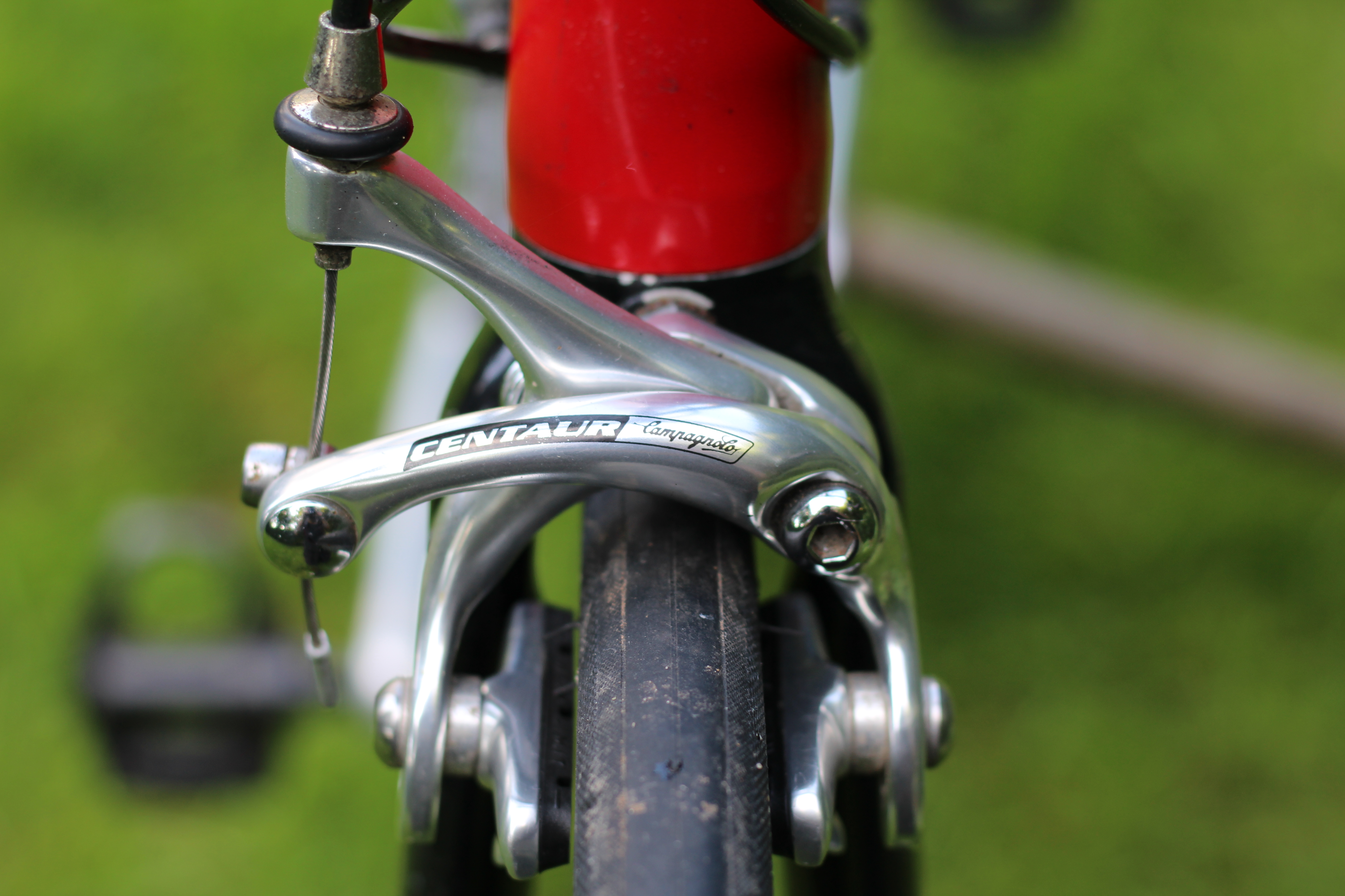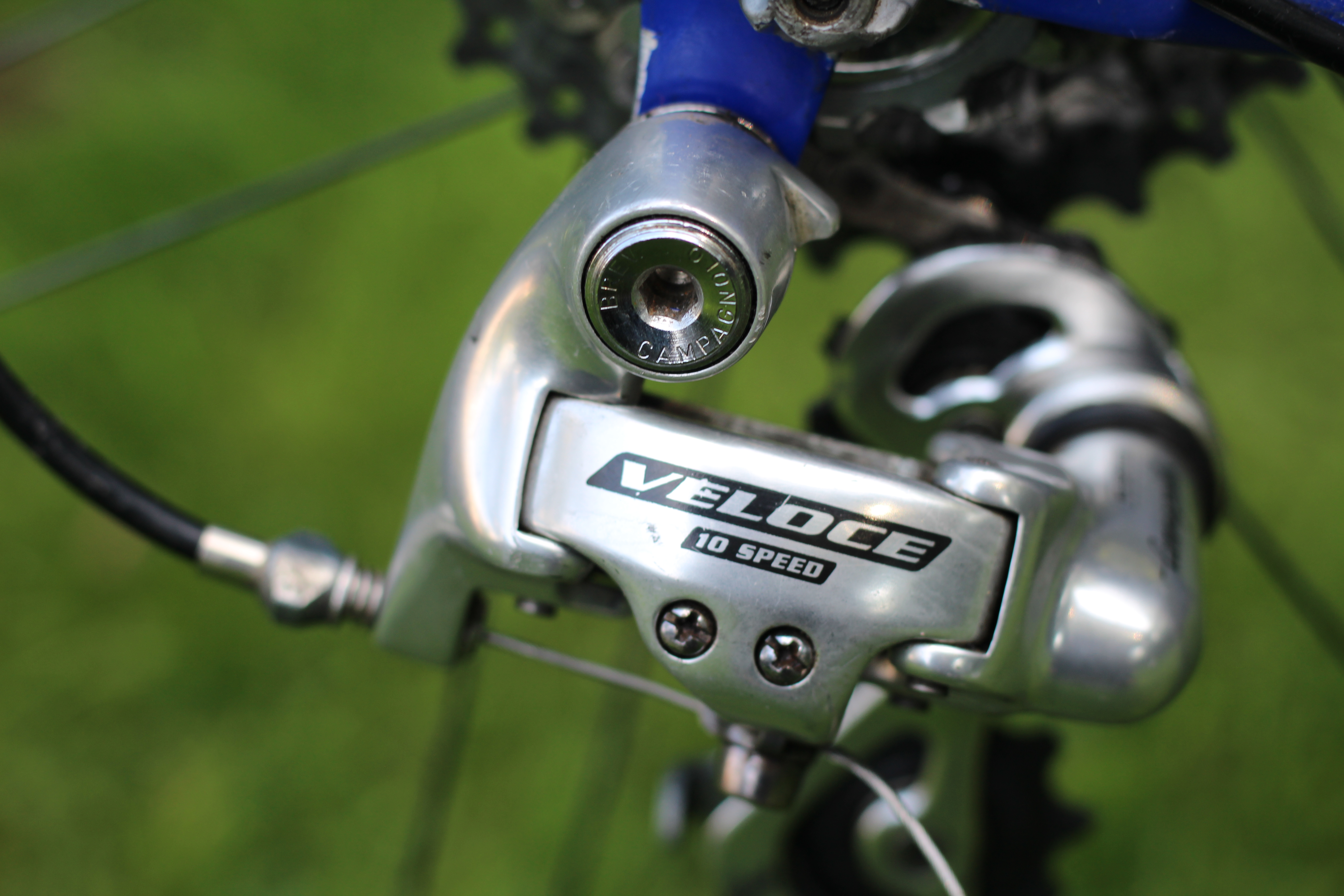 The groupset is Campagnolo’s top of the range from the time – Record with plenty of carbon and titanium. Over the course of thousands of kms, it performed flawlessly, and still does. I haven’t once had to tweak the gears, they still shift with the same reassuring clunk (agricultural was the disparaging description at the time, but I like it). The seat post and wheels are also Campagnolo, the saddle a Gios-branded Selle Italia Flite, and the bars and stem are Deda. For pedals, I used Campagnolo pro-fit from that era, which now blistered with aluminium oxide, await restoration. An all Italian affair then, that’s ridiculously light compared to what I ride nowadays, but with that saddle-to-bar drop and thin tyres (23 mm) at 100 psi, not at the comfort levels I now prefer; and, in wanting to keep my original knees, the lowest gear of 39×23 a further deterrent from riding it.