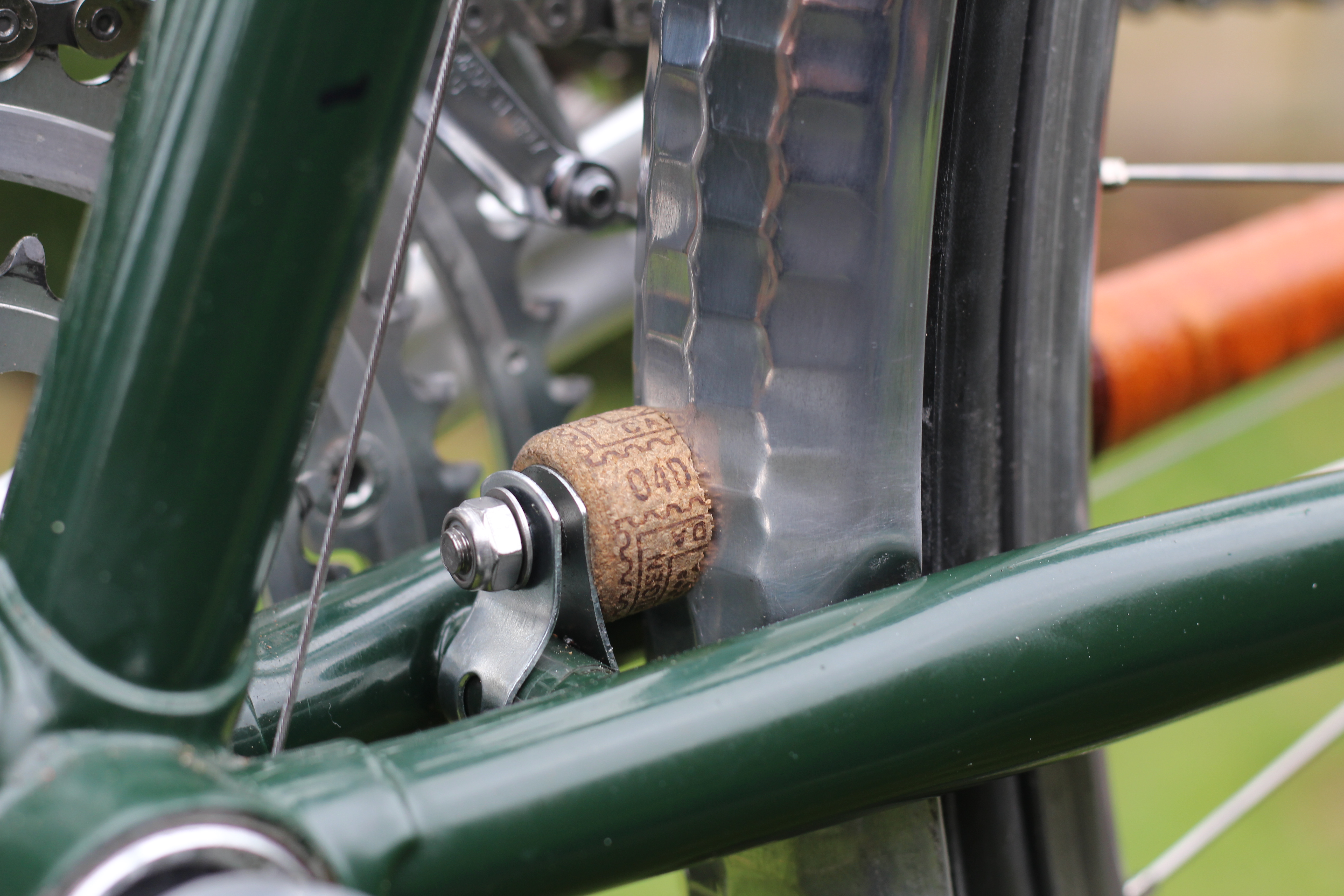 Being Honjo, the mudguards do not come pre-drilled. Four holes for the rear mudguard: two for the stays, and one each for attachment at the bridges between the seat and chain stays. Some improvisation was required at the chain stay bridge; a p-clip and wine cork the solution – perhaps not the most elegant fix, but effective.