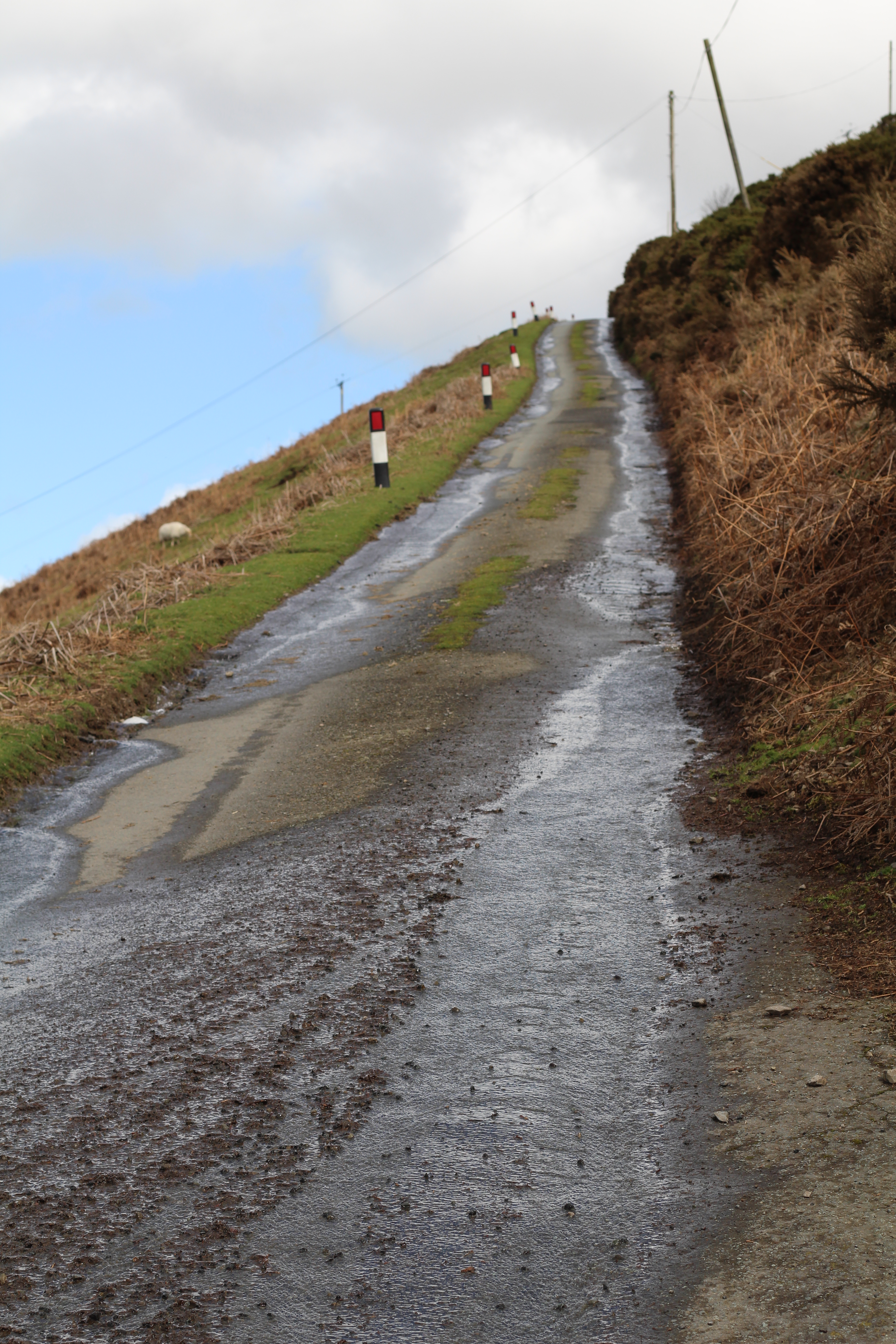 I rode pretty much parallel to the A49 to reach the northern most and lowest point of the ride. The lanes, where not pooled with water, were layered with mud or awash with debris. The three punctures suffered the previous Saturday (thorns!) made me wary of the trimmed hedgerows. It’s got to happen to someone, but three in the space of two hours. I was hoping the Gods were looking more favourable on me and I would come through unscathed. Soon it was the first significant climb of the day, Picklescott Hill. A turn to the south-west at its top and a blast of the UK’s prevailing wind. Then a descent to the foot of Ratlinghope Hill, on to Bridges, and another climb – this time Cold Hill. The Stiperstones an ever closer companion, the only companion in the main – these lanes are joyously empty.
