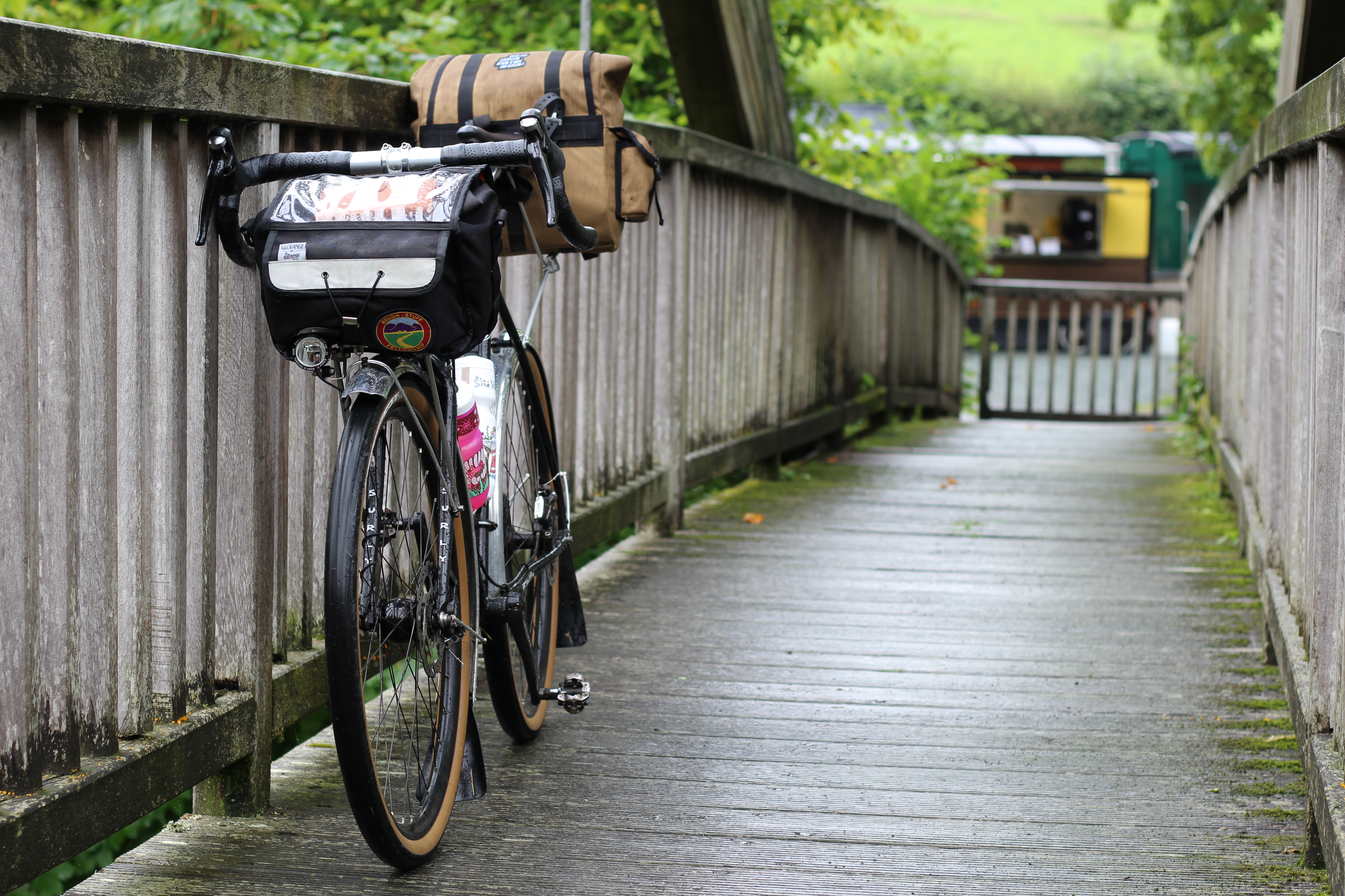 The Black Bike required some modifications for the trip. The Rene Herse Tyres were showing their age and were replaced with Panaracer Gravel Kings. The Rene Herse side-walls may be more supple, making for a faster tyre, although probably not on a bike ridden by me, but they’re expensive. The Gravel Kings are cheaper but roll well enough for my style of riding and have done the job on The Green Bike and The Purple Bike (that is also white), albeit in a different size. The front end had a Hyacinth Wild Child rack attached a few weeks back, to support the Velo Orange Randonneur Bag I’ve used on various bikes for the past few years.