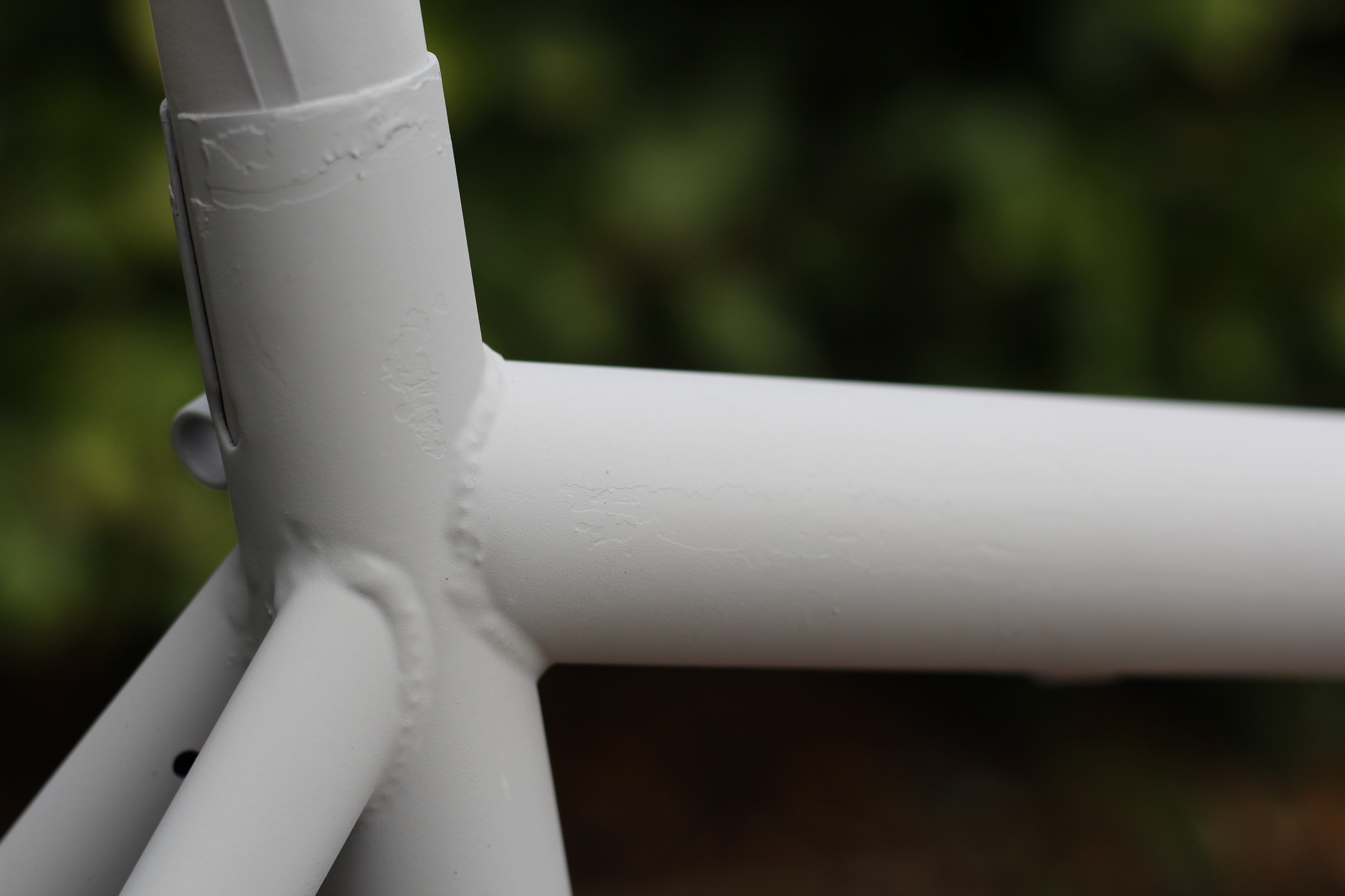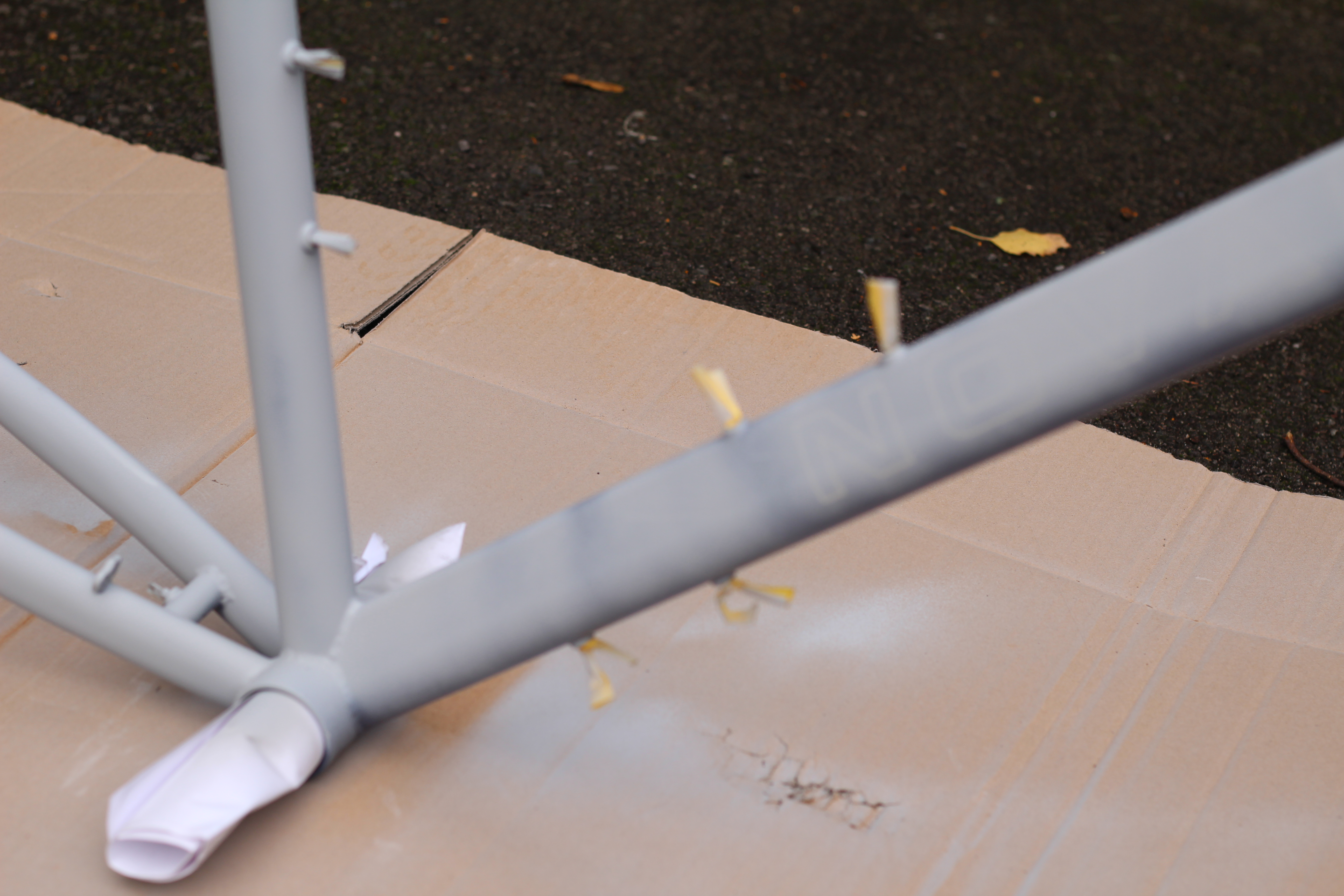 Their builder’s putty spray is meant to smooth over defects in the original paint. Turns out the there’s defects and there’s defects. Some of the defects were ones that only disappear with a complete stripping of the paint (sandpaper didn’t make much of a difference). And I ran out of the spray – since one can is meant to cover a frame (and fork?), I must have gone too thick in places (or it was the extra needed for the fork).