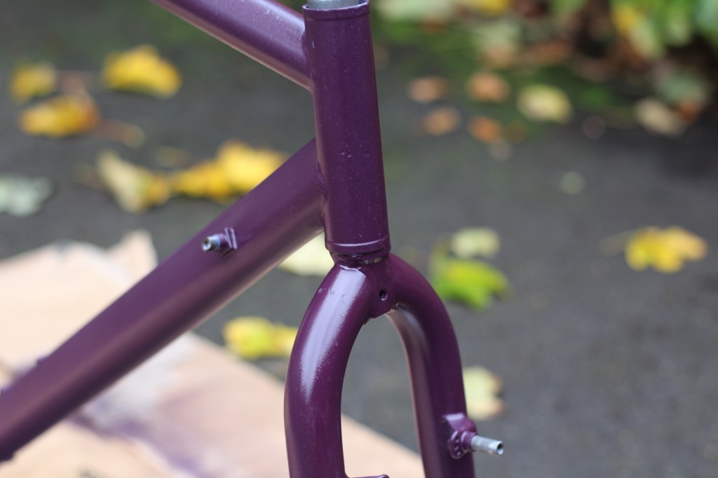 Next a coat of burgundy paint and a band of cream on the seat-tube. I was impressed with the sharpness between the two colours, no bleeding.