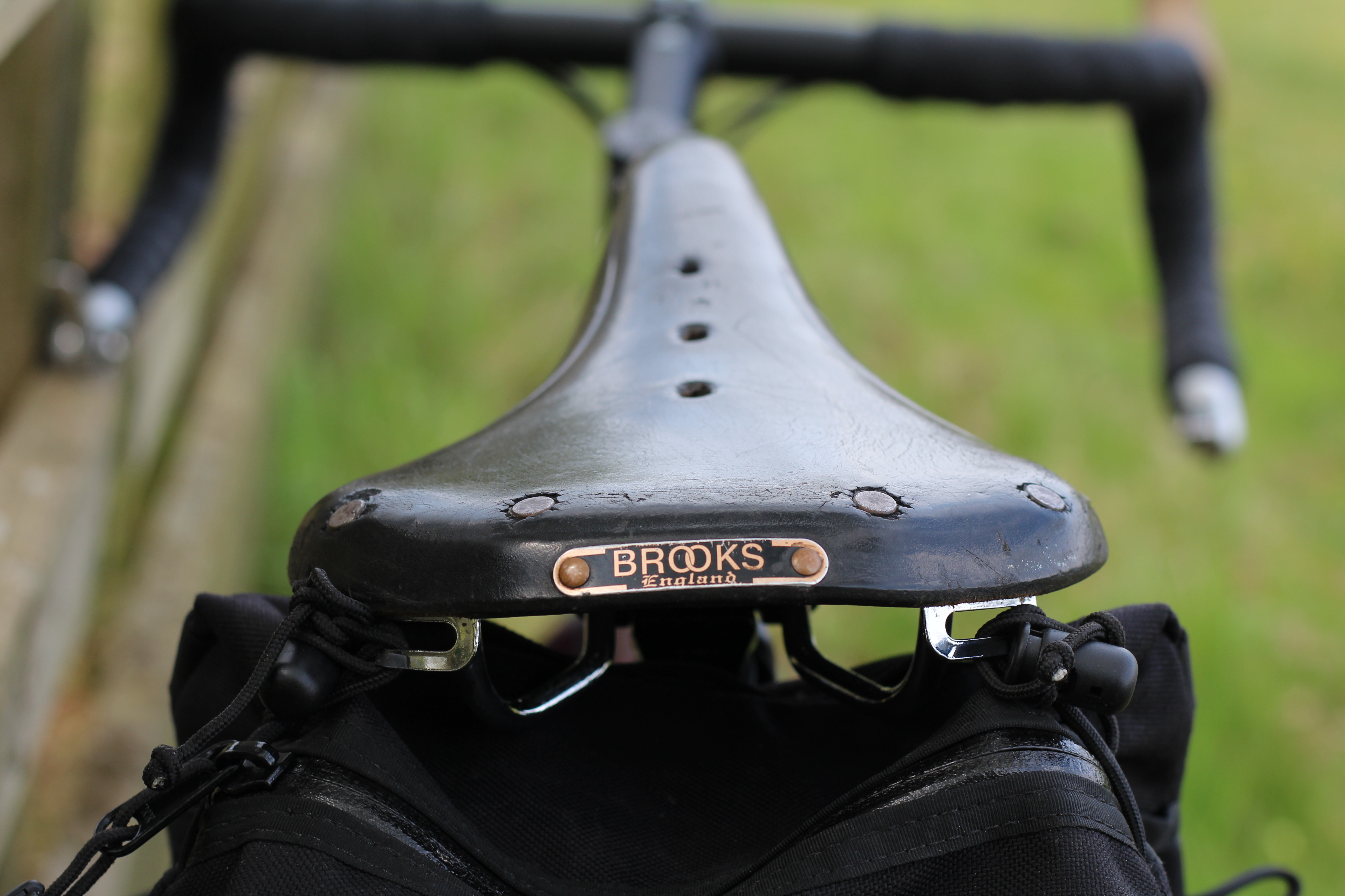 A Brooks (what else?) perch and a Velo Orange mini-randonneur bag repurposed as a saddlebag (a Carradice the inevitable destination?):