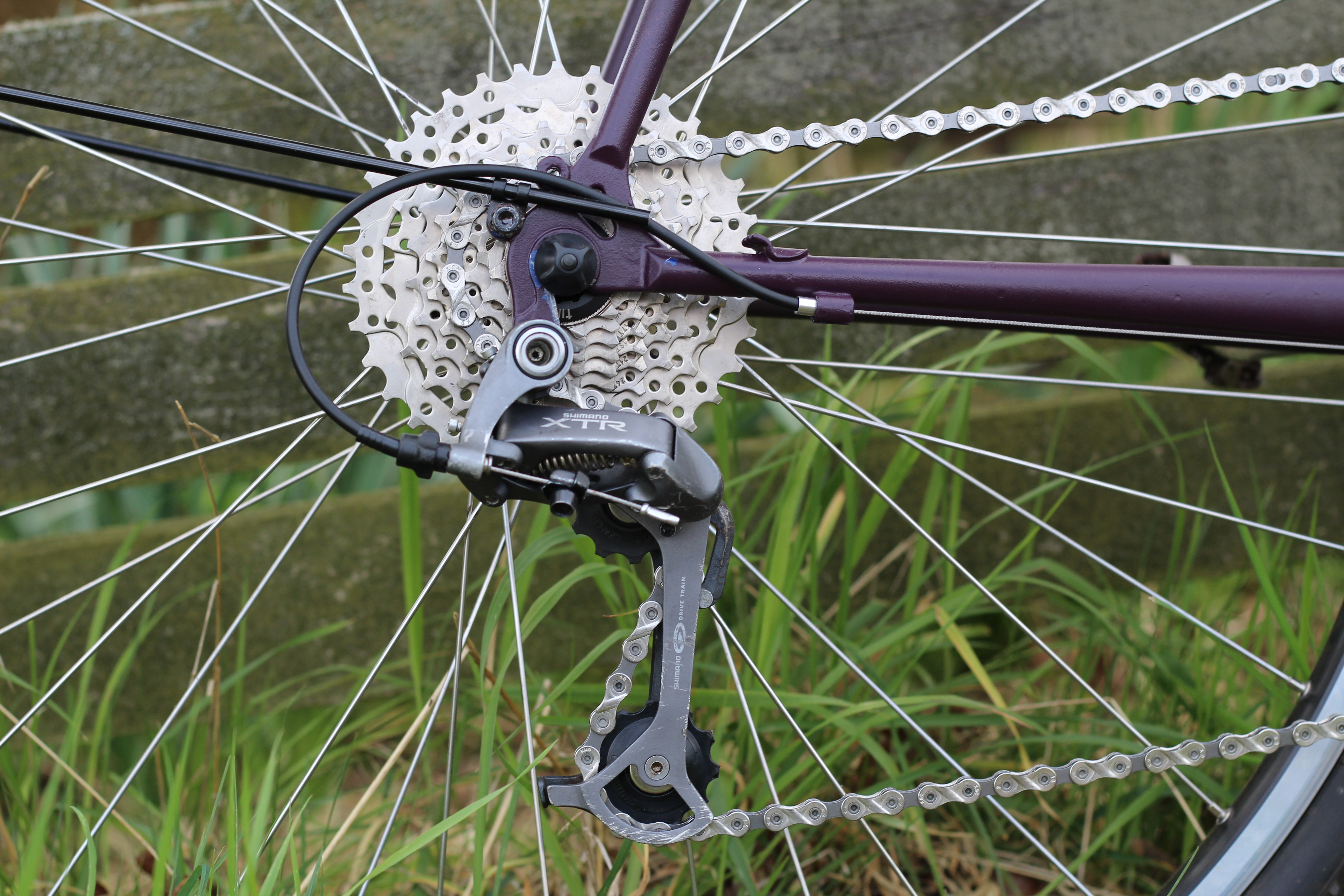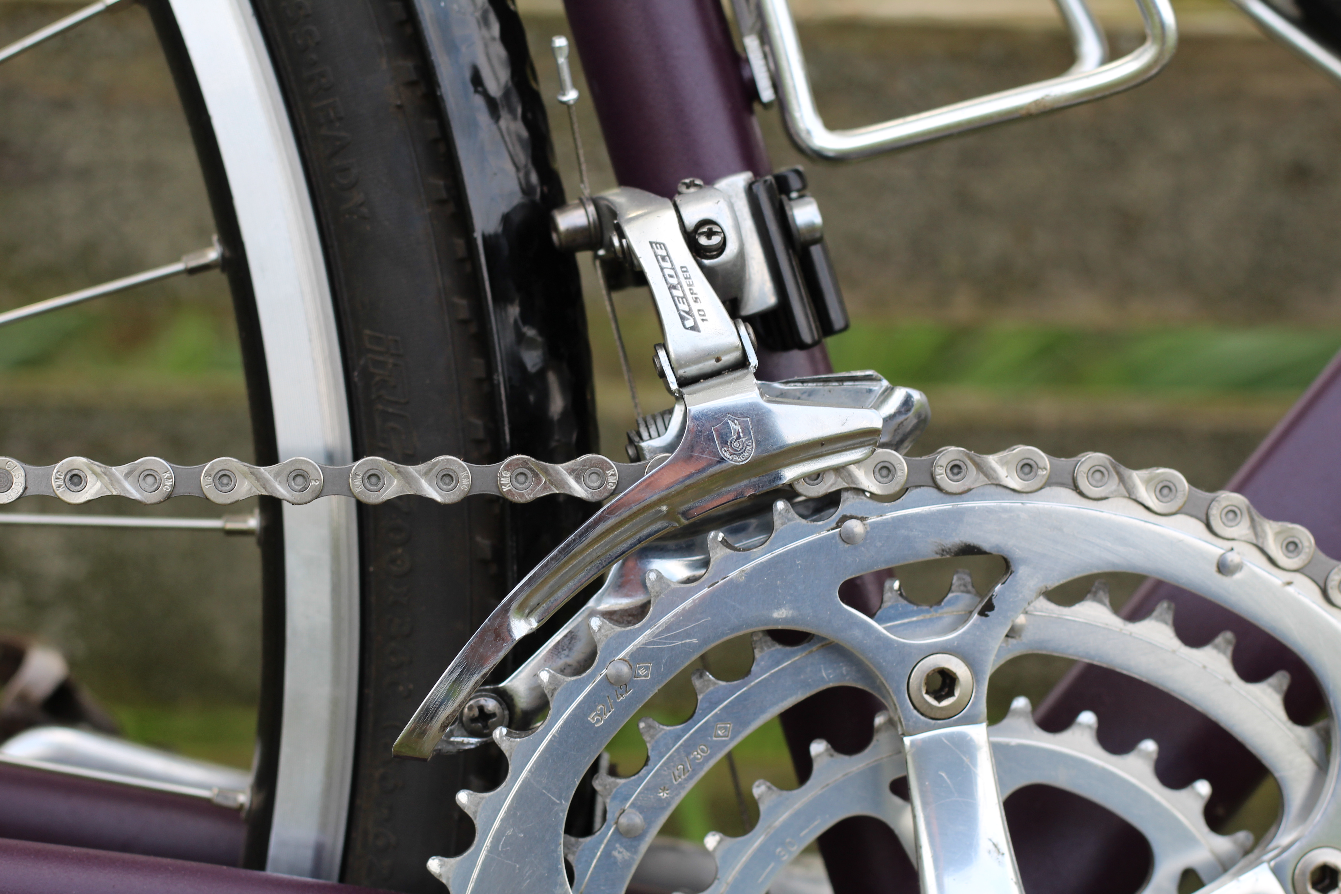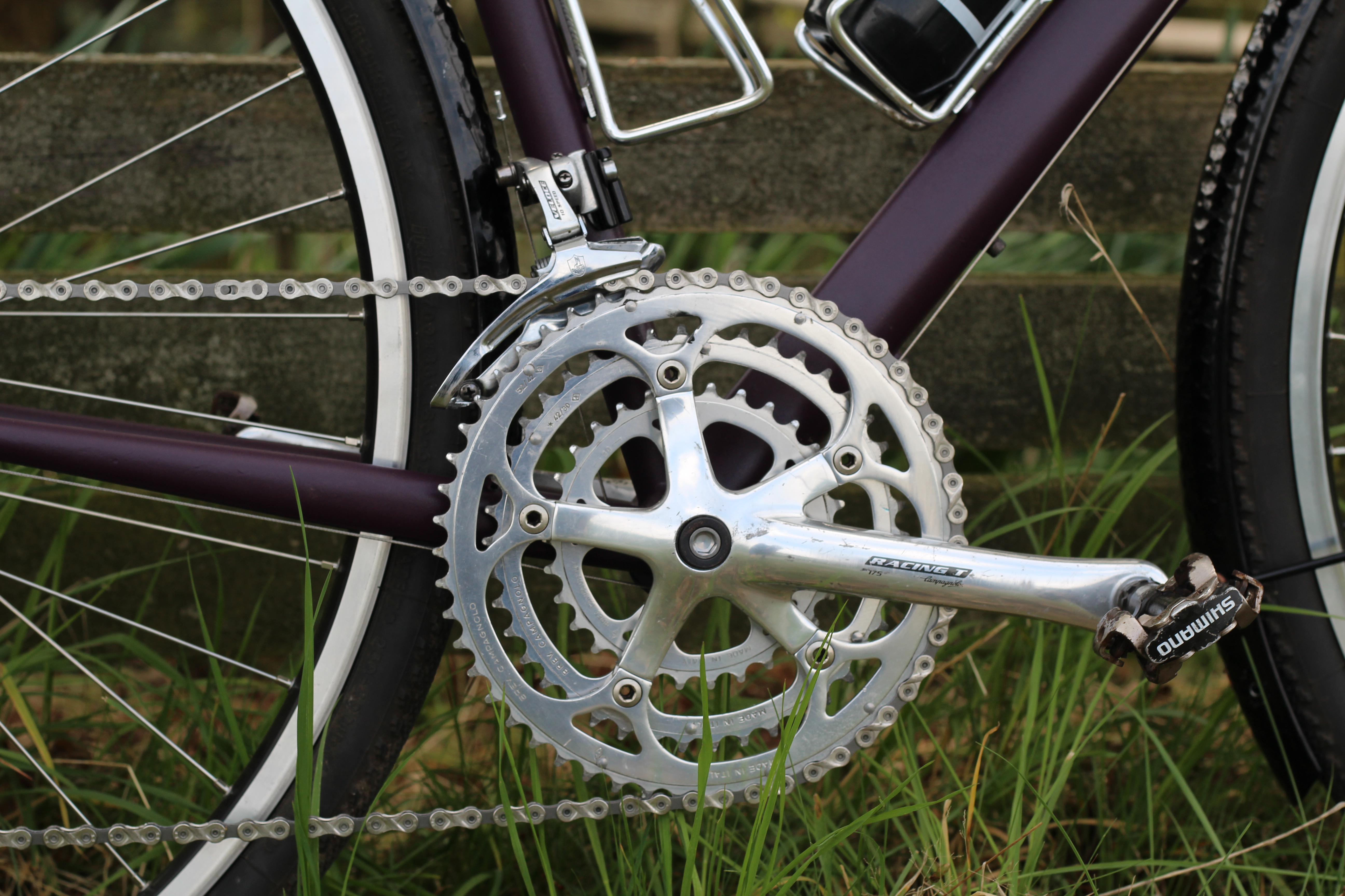 I managed to finish the build. A drivetrain – Campagnolo chain-set and front derailleur, and Shimano XTR rear derailleur – friction shifted, and with the rear derailleur being opposite motion (Rapid Rise in Shimano speak), up is up with the right-hand bar-end shifter.