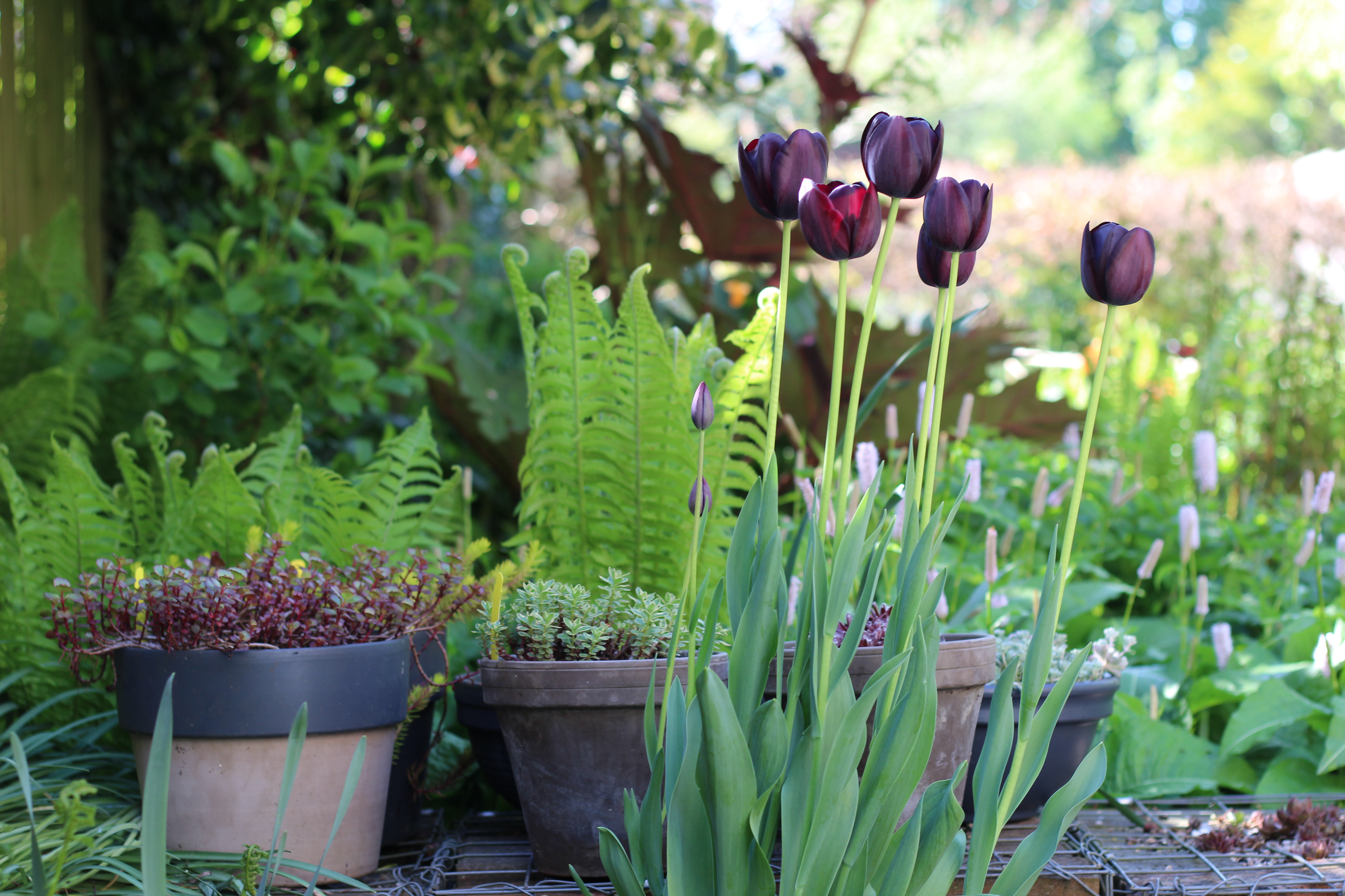 The spray can said burgundy. It’s not, is it? Not enough red, right? Some sort of purple – Aubergine? Plum? Queen of Night Tulip? Maybe not that deep a purple. They are out in force in the garden. Late April, through into May, my favourite time for the garden – pre-summer-slouch-verdancy to the fore.