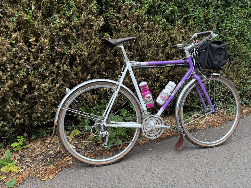 The photo above shows the tattered remains of the box moth caterpillar’s feeding. It’s a hedge in Snitterfield (guess which letter wags change the ‘n’ to), but half a mile away, a stretch of well established box at Snitterfield Bushes is untouched. And yes, The Purple Bike (that is also white) has had an airing – it must be a year since I’ve ridden it. It still rides as well as it ever did. Not quite Green-Bike-Sprightly but sprightly nonetheless. The riding position is more upright than The Green Bike, and on a short descent close to home I was reaching non-existent drops. I spend most of my time when riding it with my hands on the curves beyond the brake levers (the handlebar is a Nitto Albatross). It’s a bike I really should ride more often – I wouldn’t change a thing about it (well apart from the colour, perhaps – mixed feelings there, but it was on sale and I bit).