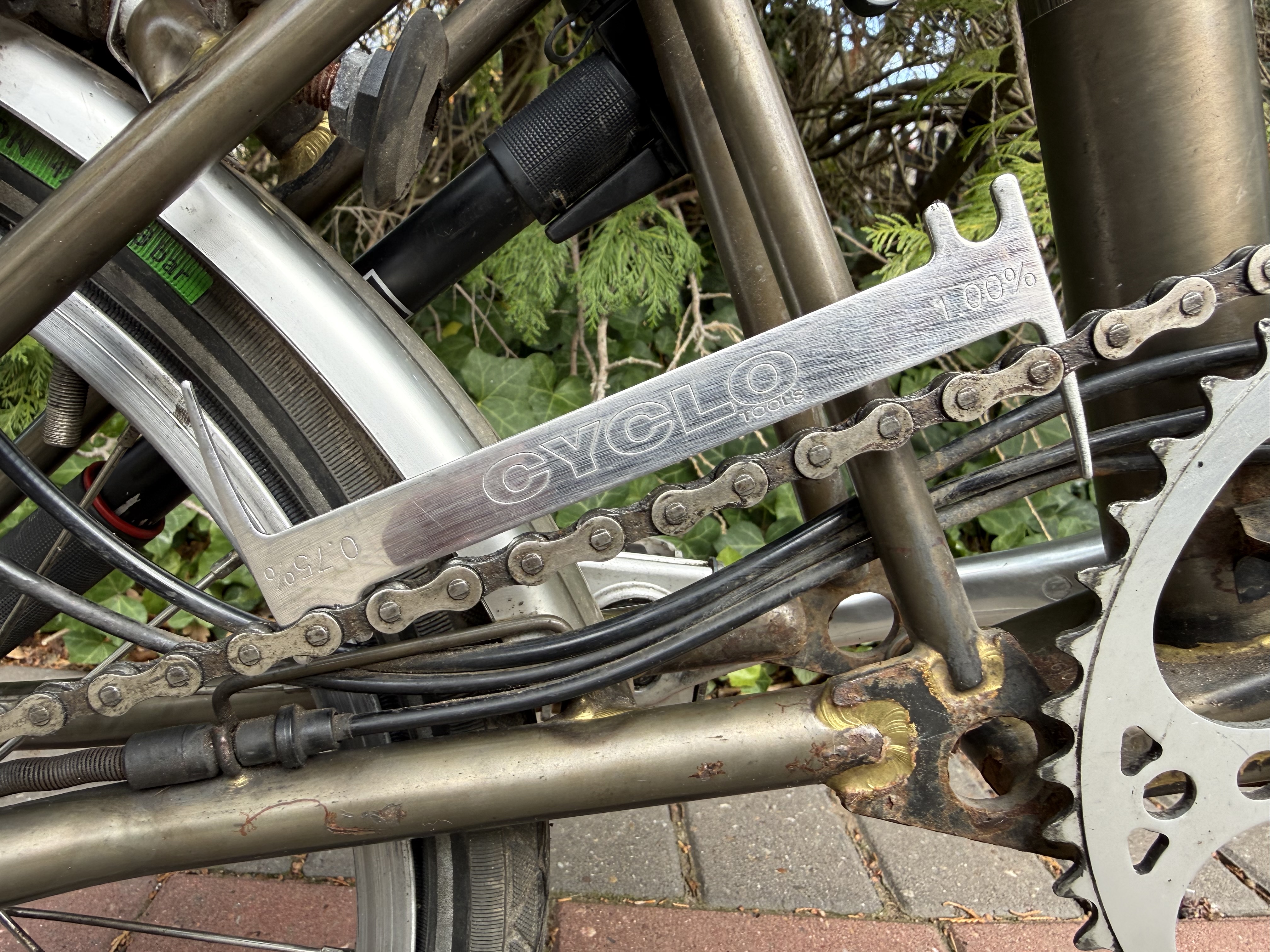 There’s always the itch to work on a bike. Tucked away in the garage is a Brompton from when I used to travel to work by train and cycled each end of the train journey. The Brompton was showing the signs of being well used when it was retired and bar the odd spin it has been unused for 15 years. Taking it out of its cover for a quick inspection: flat tyre, shark-toothed crankset, stretched chain, and corroded cables. A project to scratch the itch.