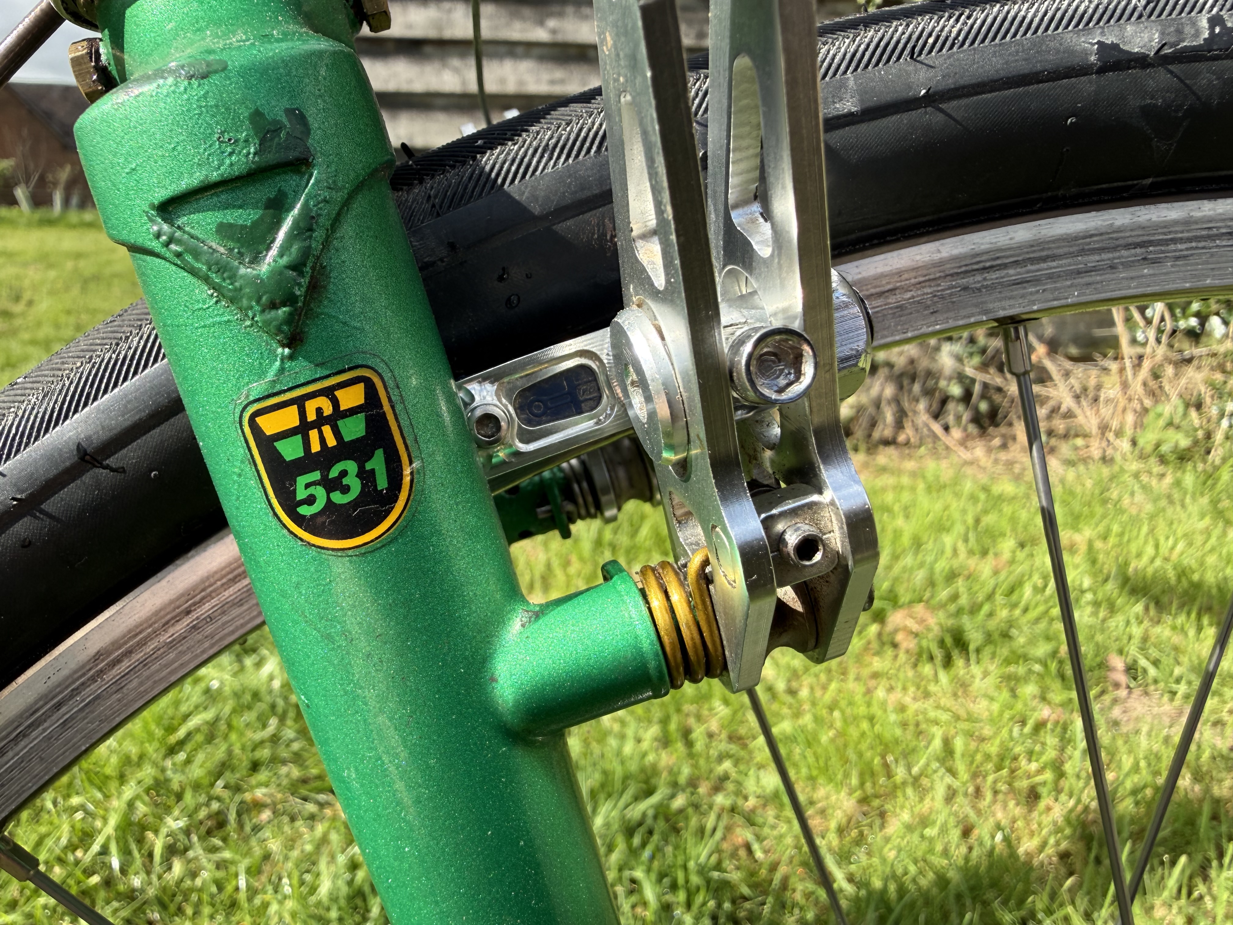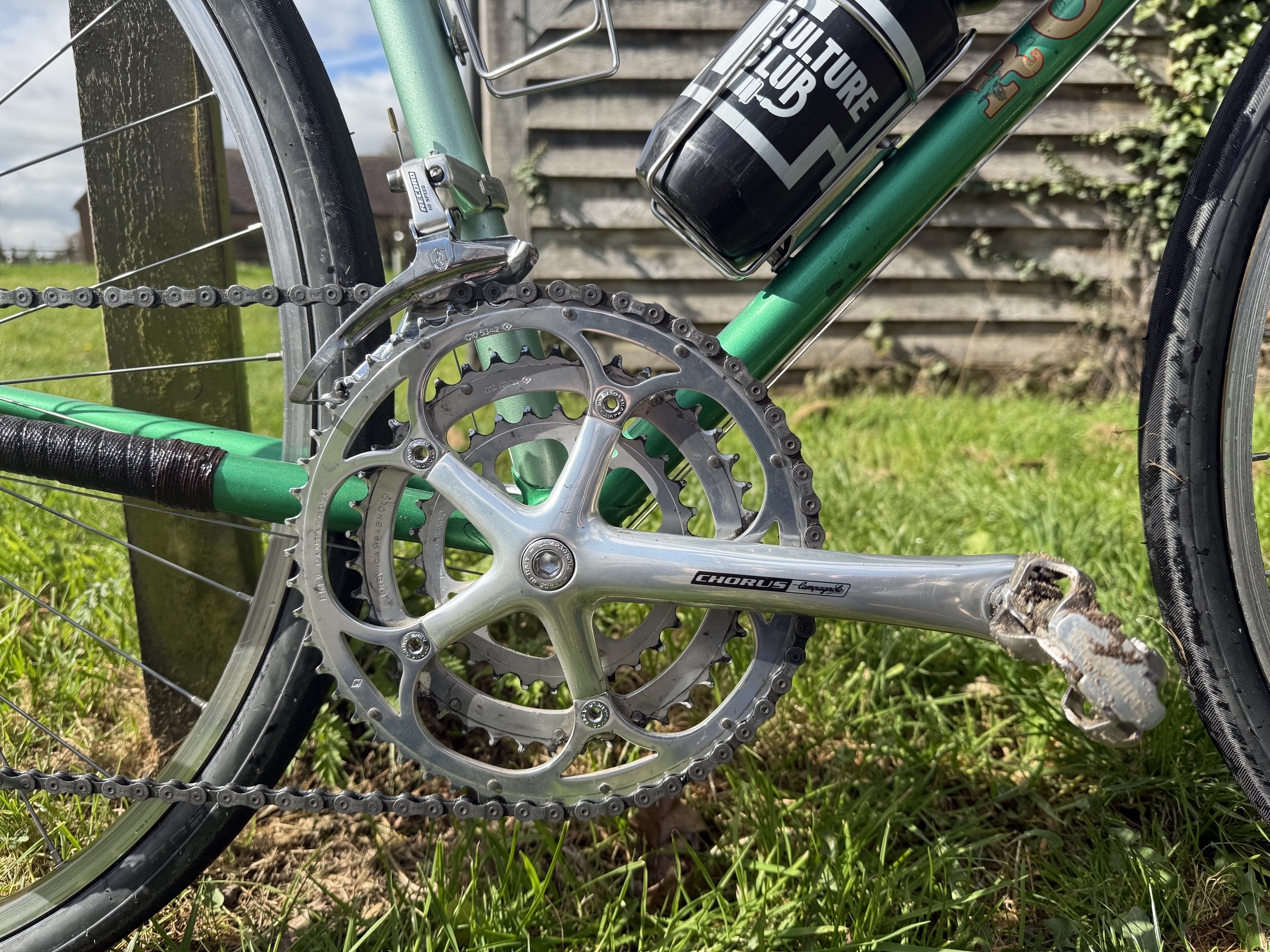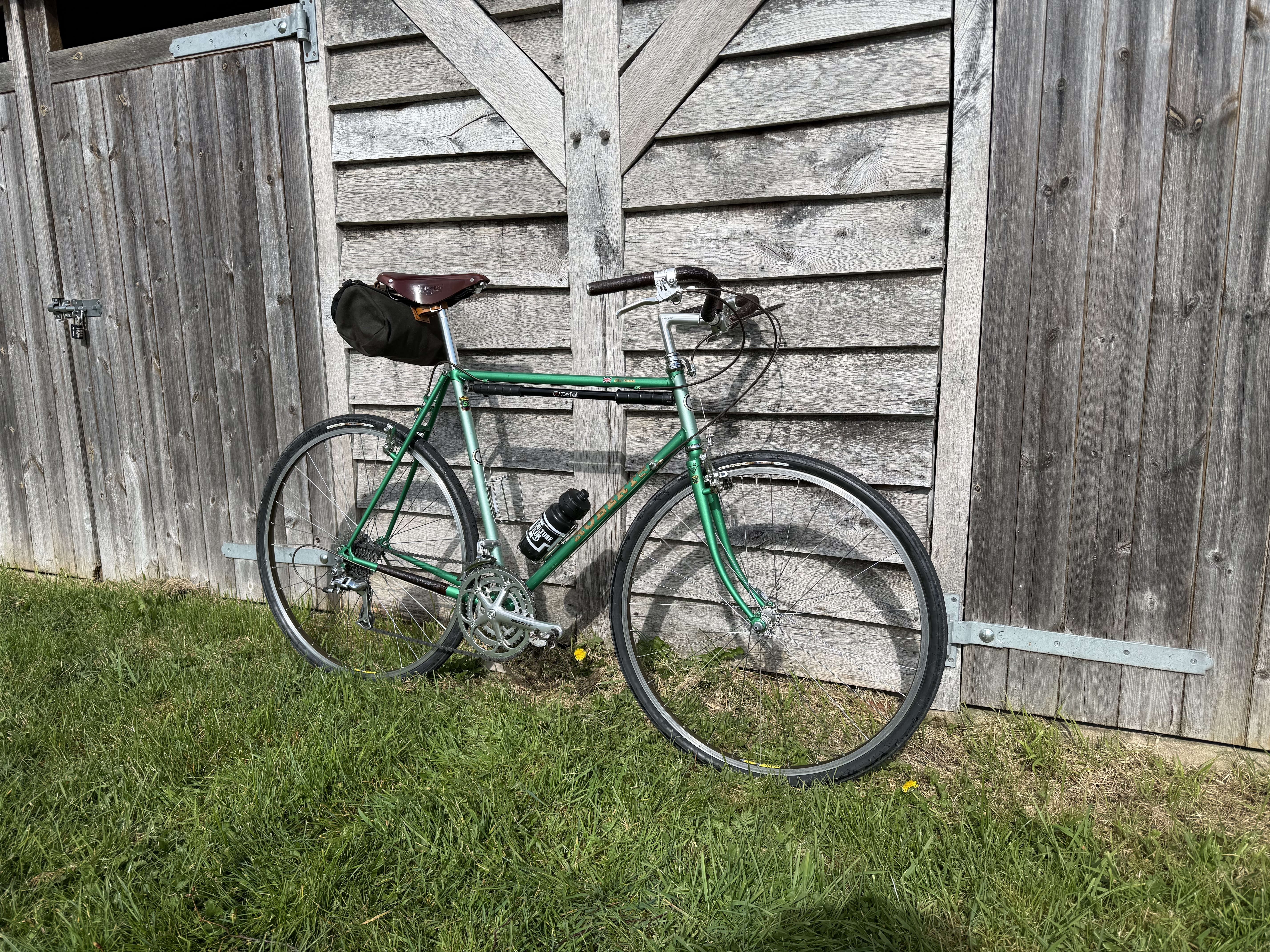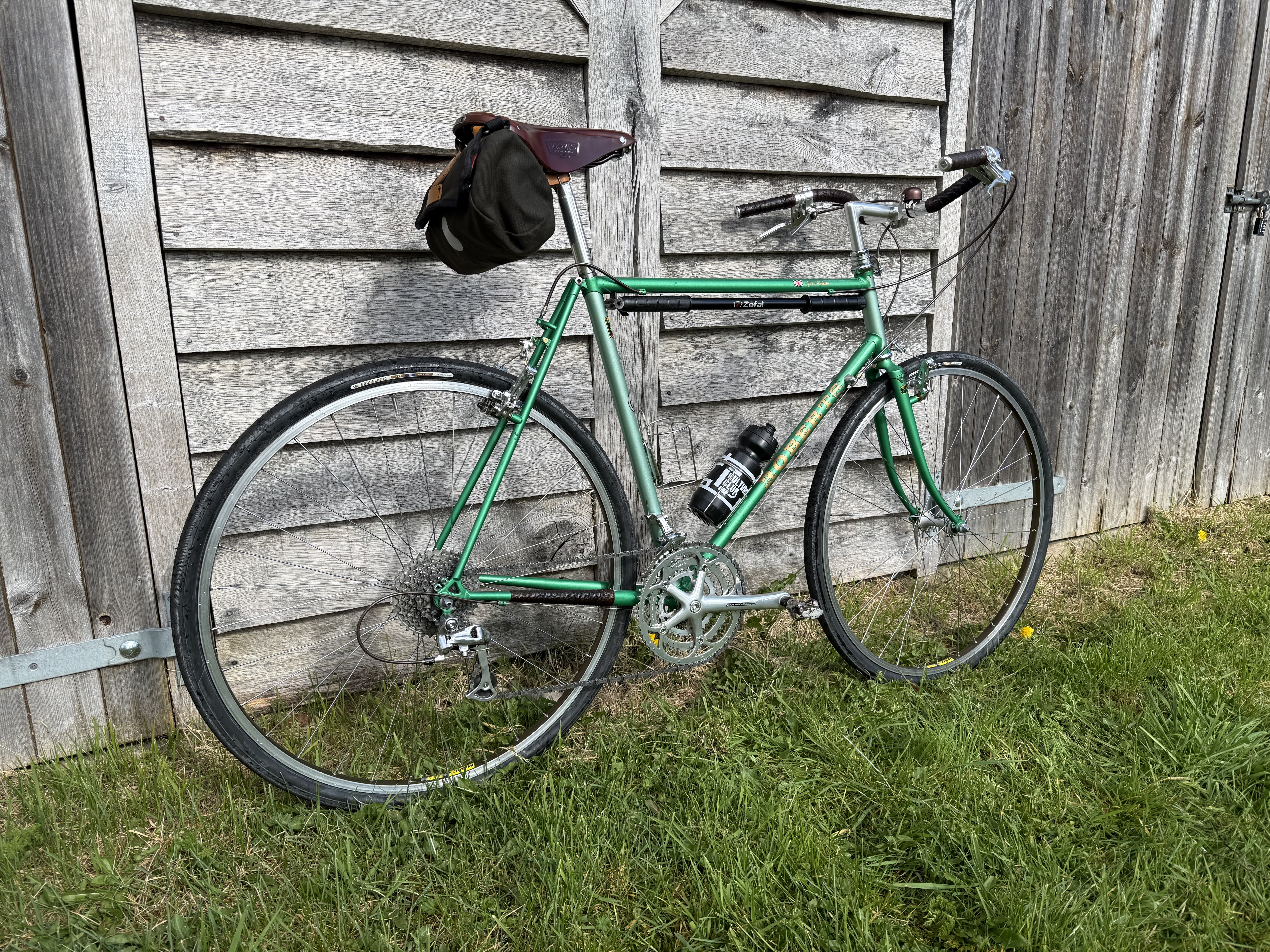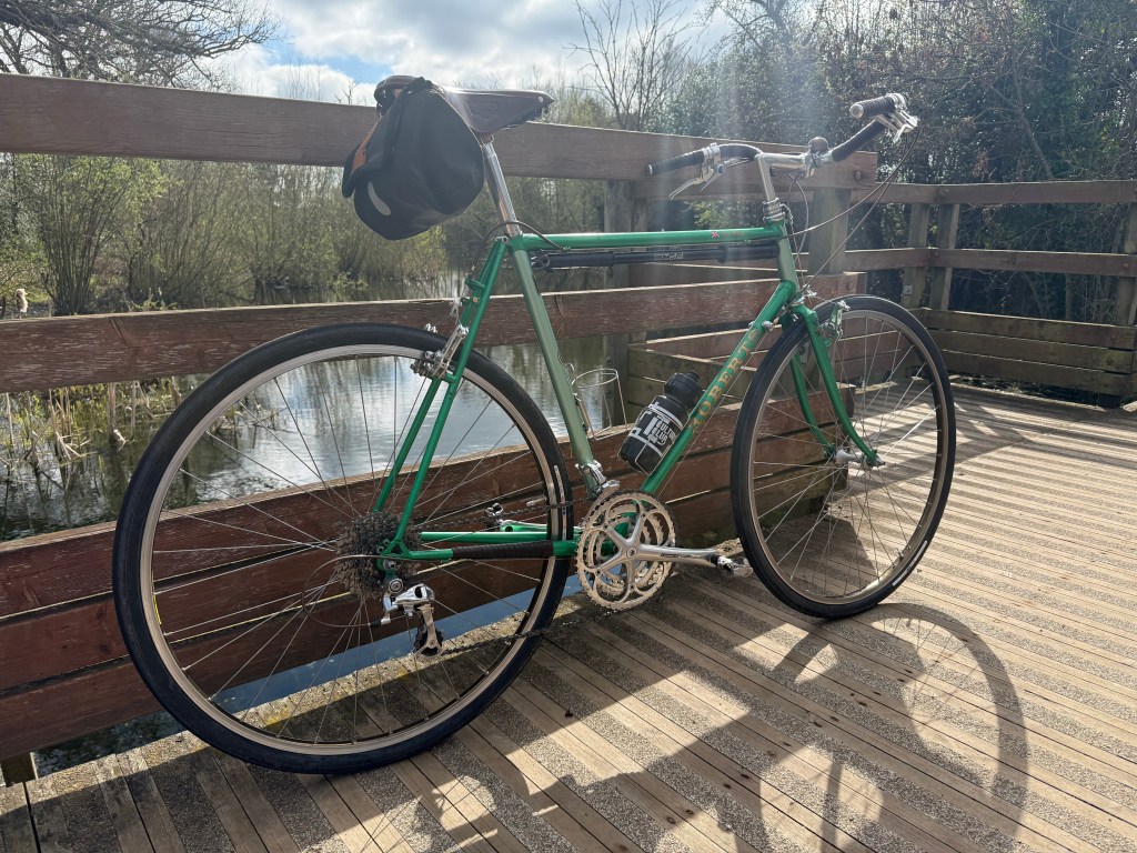 Gas pipe tubing, especially the fork, robust wheels and sturdy tyres left me at times wanting to throw it in one of the hedgerows lining the lanes. I still fettled with bikes through those hibernal months, in fact, a new bike was born: The Other Green Bike. A few weeks of daily visits to a certain online auction site (not so much auctioning now a days, most items seem to be ‘Buy it now’) and up popped a Chas Roberts’ Audax / Light Tourer from the mid-90s. A well lived frameset with plenty of patina (and not-the-right-shade-of-green touch ups) but perfectly usable. Not French-fit-usable but a candidate for swapping parts over from The Purple Bike (that is also white) and build a bike more aligned to my tastes. Well, tastes at the time. They change and now looking at the picture of The Purple Bike (that is also white) above, perhaps I should have let things be? It looks pretty good. I still have the frameset, so another project to satisfy the fettling urge.