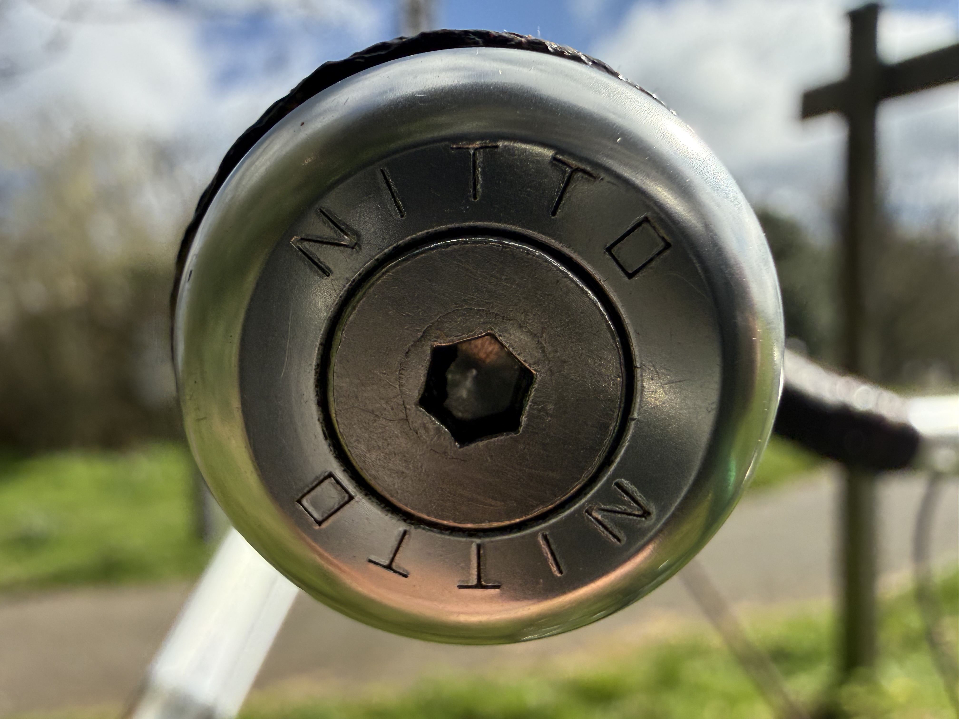The crankset and front and rear derailleur came from The Purple Bike (that is also white) but a 1” quill stem was required, and with the Albatross bars on that bike having a 31.8 mm stem clamp diameter, I purchased the Albatross’ baby brother, the B303AAF Gander bar. Positioning the gear levers on the inside of the bars required a left to right and right to left swap.